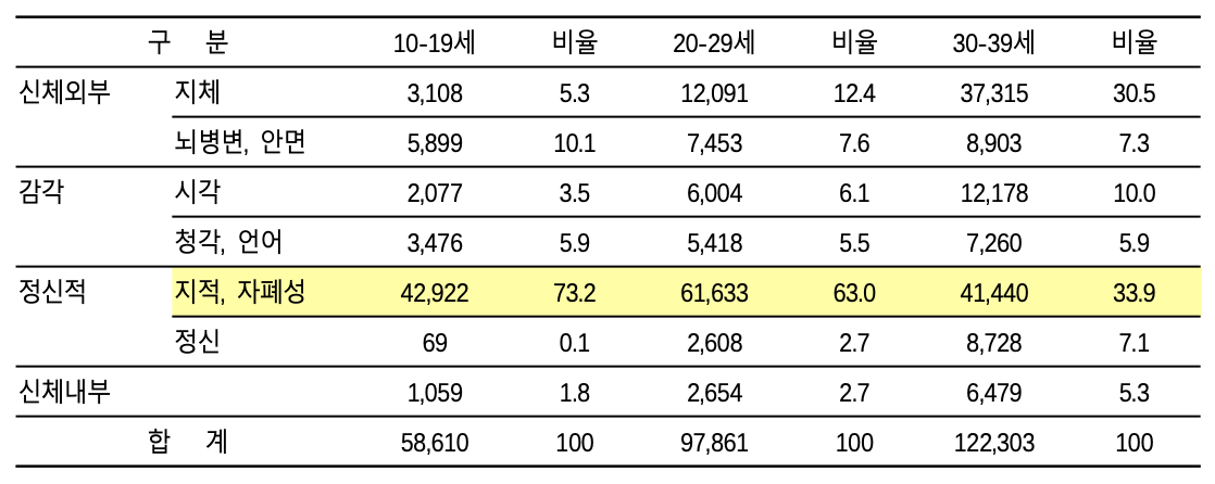 주) 장애구분은 기업체장애인고용실태조사의 장애유형별 분류를 참조하여 작성함