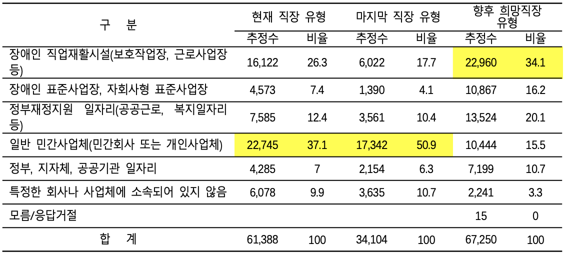 주) 마지막 직장 유형과 향후 희망직장 유형은 현재 일하고 있지 않은 발달장애인이 대상임
